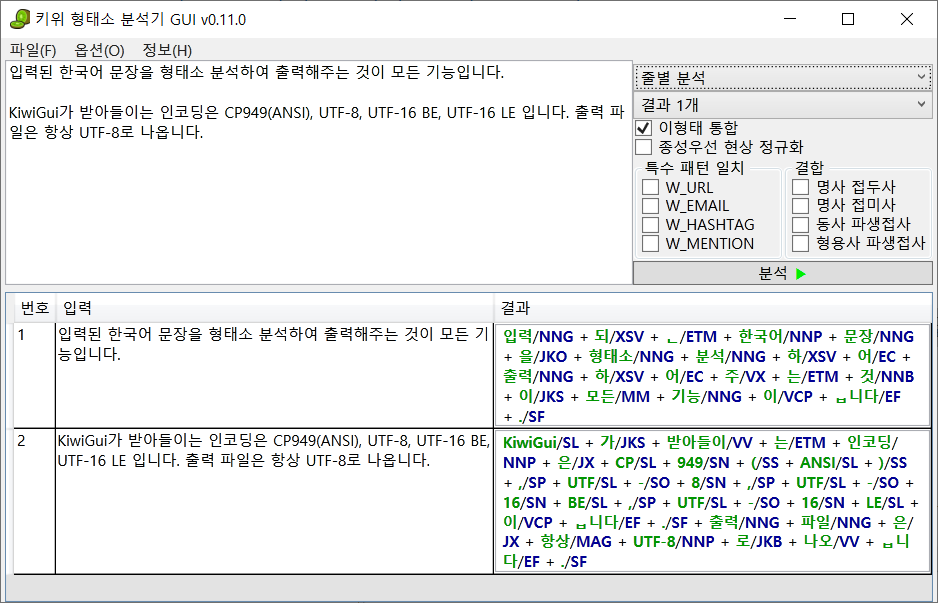 KiwiGui가 받아들이는 인코딩은 CP949(ANSI), UTF-8, UTF-16 BE, UTF-16 LE 입니다. 출력 파일은 항상 UTF-8로 나옵니다.