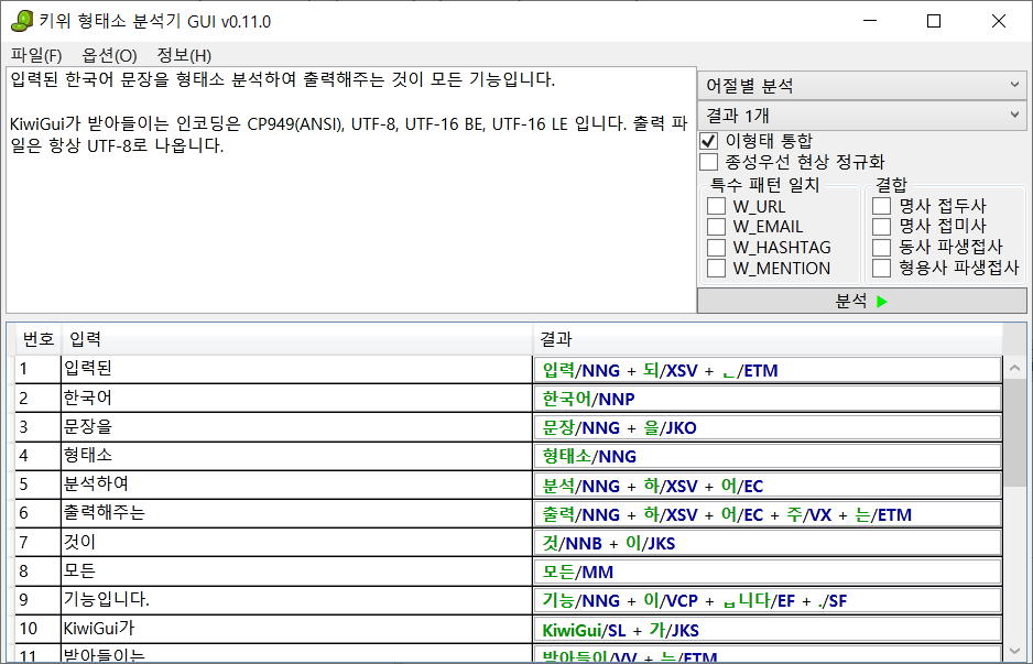 웹 버전 말고 윈도우즈용 GUI 버전의 Kiwi 형태소 분석기를 구하시는 분들이 의외로 많으셔서, 간단하게나마 GUI를 입힌 버전을 만들어보았습니다.
