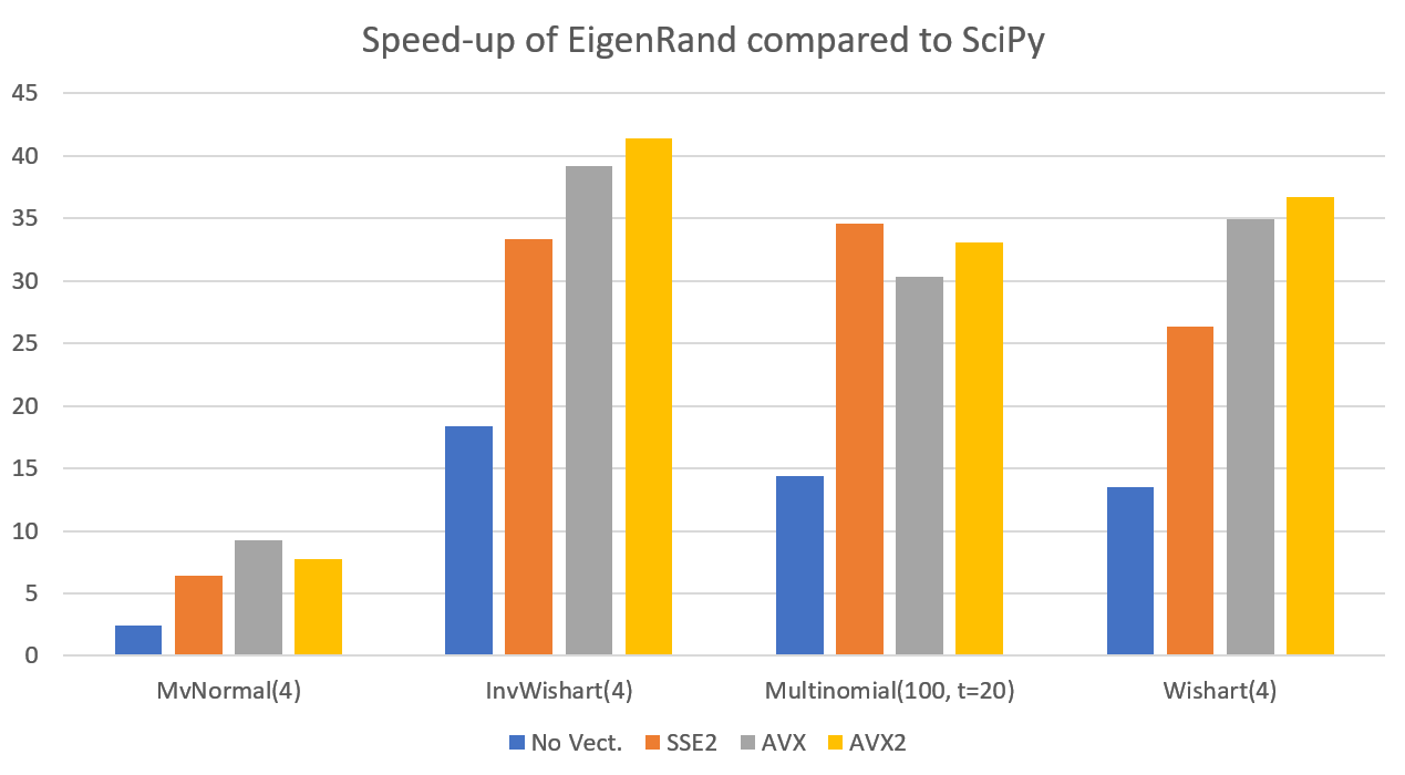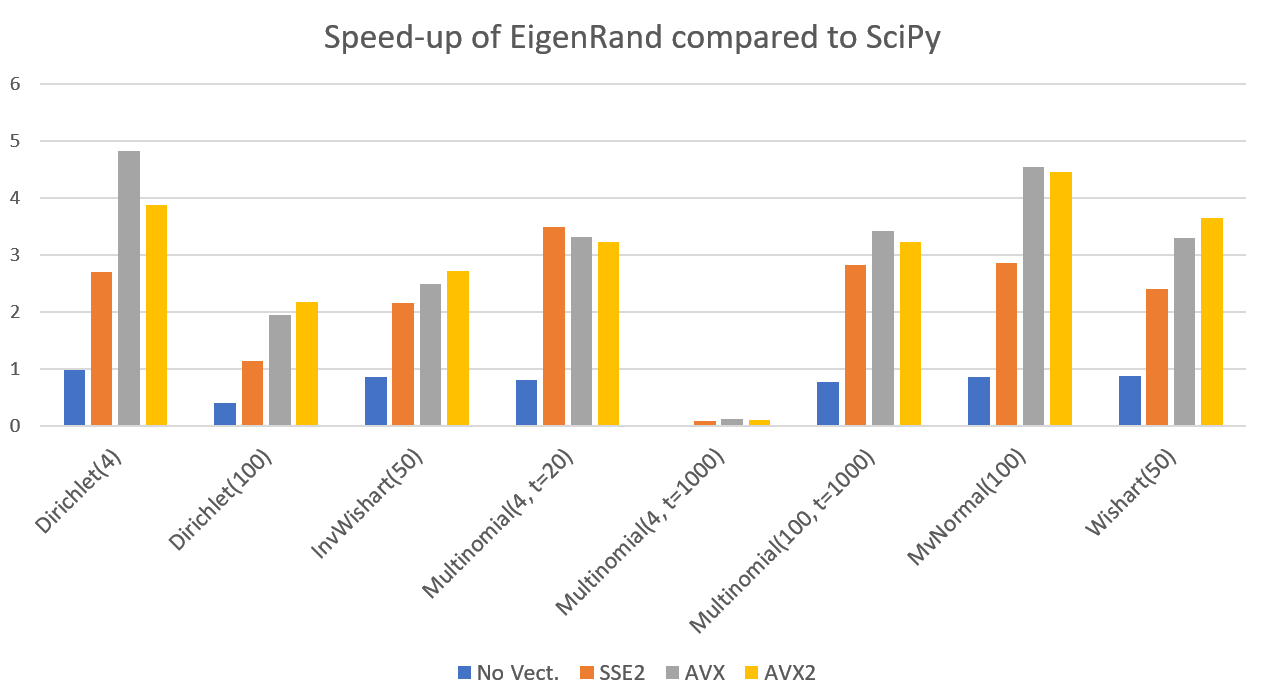 예외적으로 낮은 차원의 벡터를 생성하는 Multinomial의 경우 Python보다 비효율적인 결과를 보여주었는데, 이는 SciPy의 multinomial함수가 binomial을 반복호출하는 것으로 결과를 생성하는 반면, EigenRand에서는 이 과정이 Vectorization이 불가하여 불가피하게 직접 표본을 시행횟수 t만큼 추출하는식으로 구현했기 때문에 발생한 문제입니다. 이 부분은 조금 더 개선이 필요해보입니다.