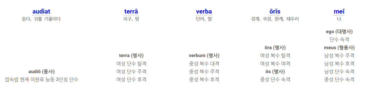 사실 문제는 또 있습니다. 목표 언어가 라틴어이기 때문에 발생하는 문제인데요, 이 언어는 한 단어가 수 십~수 백 가지 형태로 굴절합니다(문법적 역할에 따라 단어의 모양이 달라집니다). 단어의 형태에 영향을 미치는 문법적 자질은 서법(mood), 시제(tense), 태(voice), 인칭(person), 성(gender), 수(number), 격(case), 급(degree)로 총 8가지입니다. 이들의 가능한 조합의 수는 어마어마하지요. 보통 명사는 10여가지, 형용사는 90여가지, 동사는 수 백 가지 정도됩니다.