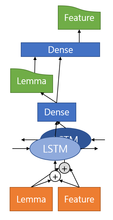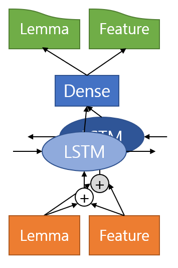 이 단락에서는 좀 더 기술적인 내용에 대해서 소개합니다. 먼저 언어 모델로는 단순 BiLSTM을 사용했습니다. Attention이 포함된 모델이나 최신 유행하고 있는 Transformer 기반의 GPT 모델도 사용해봄직하지만, 자기 학습을 위해서는 모델 학습 과정에서 학습 뿐만 아니라 끊임없이 추론도 함께 수행해야하므로 무거운 모델을 최대한 배제하기로 했기 때문입니다. 또한 크고 무거운 모델을 학습시킬만큼 데이터 양이 많지 않기도 했구요. Lemma와 Feature는 벡터로 임베딩하여 더한 뒤 BiLSTM 셀의 입력으로 들어갑니다. LSTM셀은 입력된 (Lemma, Feature) 조합의 다음에 나올 (Lemma, Feature) 조합을 예측합니다. (정확하게는 Forward LSTM에는 다음 단어를 예측, Backward LSTM에서는 이전 단어를 예측하겠지요.) 두 LSTM에서 생성된 결과는 Dense 레이어를 통과해 Lemma와 Feature 결과를 만드는데에 사용됩니다.