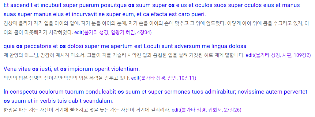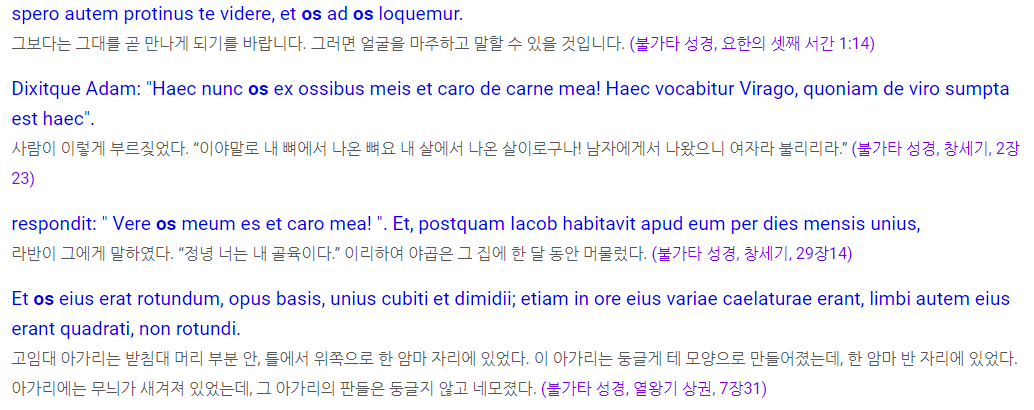 다음은 os라는 형태를 공유하는 두 명사 os입니다. 둘다 주격에서는 os라는 형태지만 '입'을 뜻하는 os는 oris, ori 등으로 변화하고 '뼈'를 뜻하는 os는 ossis, ossi 등으로 변화합니다. 따라서 모델이 oris나 ossis 등의 분포를 통해서 각 단어의 의미를 대략적으로 파악하여, os가 등장할 때 '입'의 맥락에서 쓰였는지 '뼈'의 맥락에서 쓰였는지 구분할 수 있게 됩니다. 이론은 완벽했지만, 뼈로 분류된 os중 1,4번은 잘못 분류되었네요.