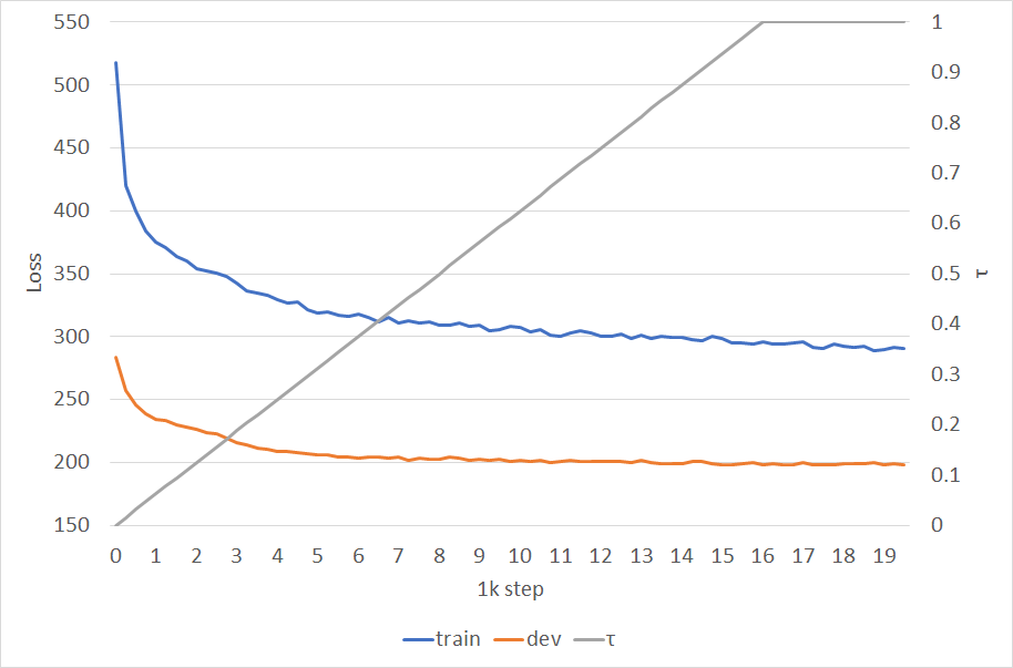 위의 그래프를 보면 $\tau$를 서서히 증가시킴에 따라 train loss와 dev loss가 안정적으로 감소하는 것을 확인할 수 있습니다. $\tau$를 너무 빨리 증가시키면 모델이 엉뚱한 결과를 배워버려 loss가 수렴하지 못하고, $\tau = 0$으로 고정하면 loss가 최적값에 도달하지 못합니다. 학습이 잘 진행된 것 같으니 900문장의 평가 데이터를 이용해서 성능 평가를 진행해보았습니다.
