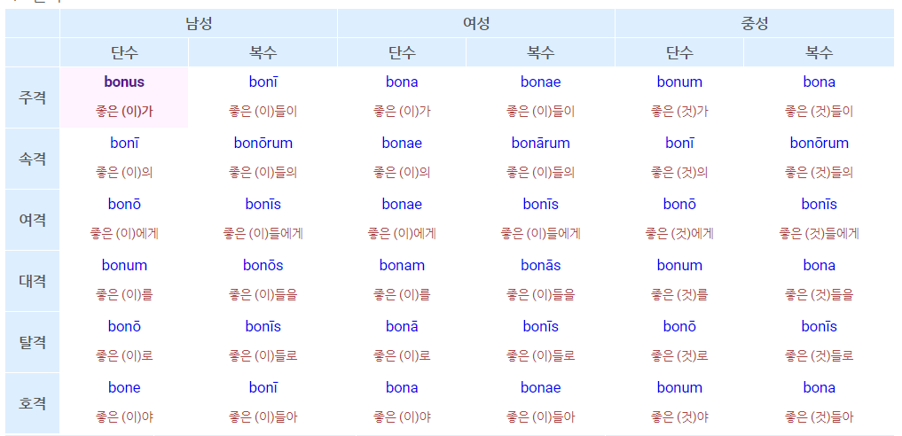 1번의 경우 웹사이트용 사전을 개발하면서 라틴어 단어별 변화형을 패턴별로 모아두었습니다. 변화형이 많아서 무지막지해보일지도 모르지만, 사실은 대부분의 규칙에 의해 변화하기 때문에 규칙만 숙지하면 대부분의 변화를 규칙에 의해 설명할 수 있습니다. (그런데 규칙을 숙지하는게 어려운게 문제..) 따라서 1번을 이용해 어떤 형태의 단어가 주어지면, 이 단어가 어떤 사전 원형(lemma)의 변화형태인지 나열해볼 수 있습니다. 예를 들어 bona가 주어지면 이게 bonus의 여성 단수 주격이거나 bonus의 중성 단수 대격이라고 알 수 있는 식이지요. 이를 통해 임의의 단어가 주어졌을때 품사와 8개의 자질을 맞추는 문제는 주관식에서 객관식으로 바뀌었습니다. 규칙에 기반해 주어지는 후보목록 중 정답 하나만을 선택하는 되는 거지요. (그러나 사전에 등재되지 않은 단어나 고유 명사 등에 대해서는 여전히 주관식으로 문제를 풀어야합니다.)