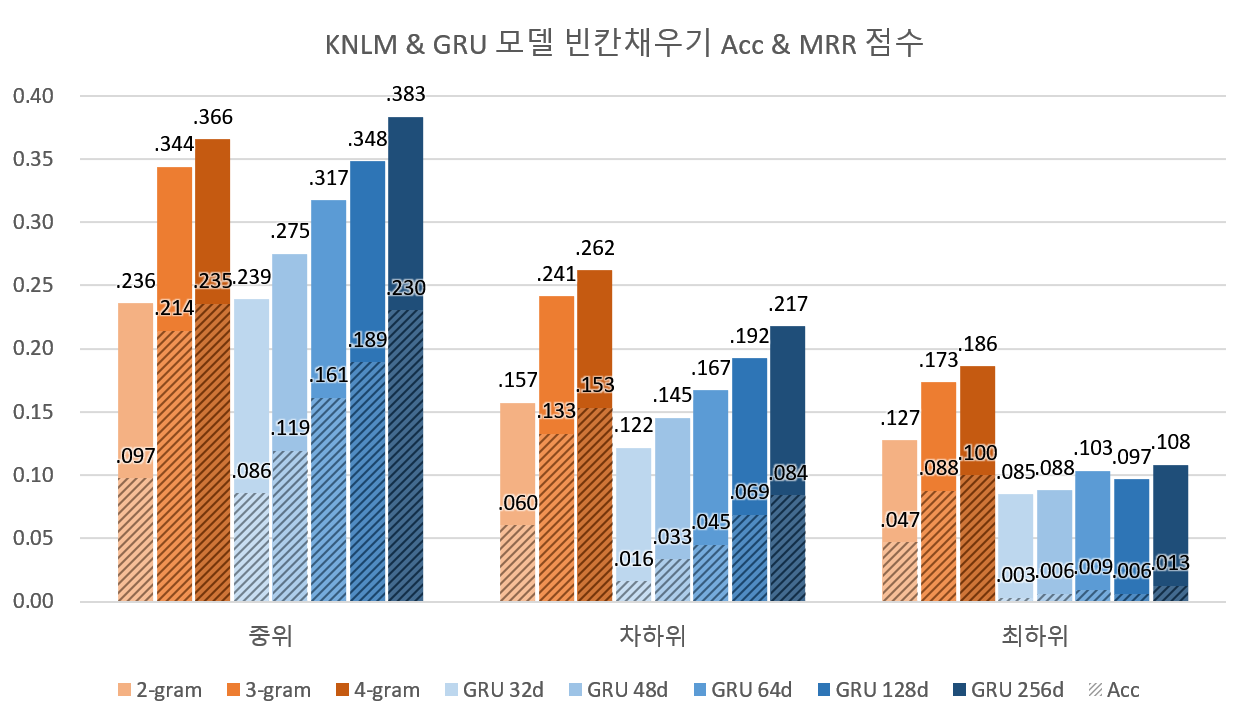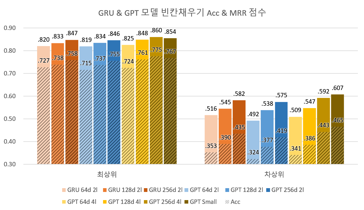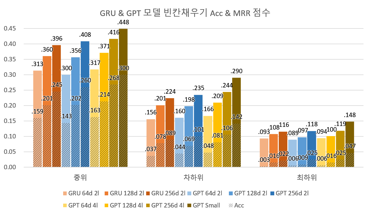 신경망 모델이 중하위 빈도 단어들에 대해서도 높은 성능을 내도록 하려면 모델의 크기를 키우고, 저빈도 단어가 포함된 학습 데이터를 보강하면 됩니다. 불행히도 이번 실험에서 학습데이터는 고정되어 있는 상황이기 때문에 좀 더 큰 모델인 2-layer GRU와 GPT를 추가로 빈칸채우기 작업에 투입해봤습니다.