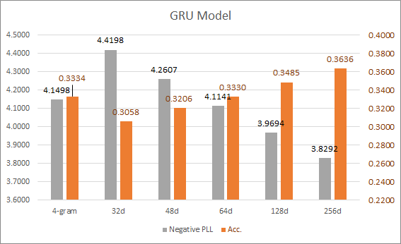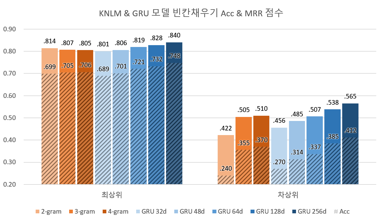 먼저 최상위 및 차상위 결과를 봅시다. 최상위 단어의 경우 2-gram에서 4-gram으로 가면서 MRR은 하락하는데, Acc는 상승하는 특별한 패턴을 보이고 있습니다만 그 폭이 작아서 유의미하다고 보긴 어렵네요. GRU계열 모델의 경우 64d 이상부터는 4-gram을 앞서는 모습을 보여줍니다. 이는 위에서 언어모델 PLL 평가가 보여주었던 결과와 일치합니다.