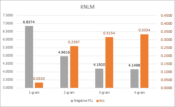먼저 Kneser-ney n-gram 모델의 결과입니다. 사실 1-gram은 모든 단어를 독립으로 간주하므로 언어 모델로 치기도 어려운데요, 그래도 언어 모델이 가장 나쁠 경우 어디까지 떨어질 수 있나를 살펴볼 수 있으므로 베이스라인으로 삼기에 아주 적절합니다. 자명하게도 n이 커질수록 Negative PLL값은 더 작아지고, 정확도는 더 높아지는 걸 볼 수 있습니다.
