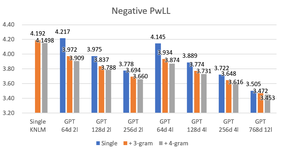 먼저 LL 결과입니다. 제일 왼쪽의 Single KNLM은 앙상블없이 3-gram과 4-gram을 단독으로 사용할 결과이고, 나머지들은 신경망 모델을 단독으로 사용할 경우(Single), 3-gram과 앙상블할 경우(+ 3-gram), 4-gram과 앙상블할 경우(+ 4-gram)의 성능을 보여줍니다. 3-gram를 단독으로 쓸 경우 NPWLL이 약 4.192정도이고 GRU 32d를 단독으로 쓸 경우 4.420이지만, 이 둘을 앙상블해서 사용하면 4.051로 LL이 크게 개선됩니다. 자명하게도 앙상블 후의 성능은 앙상블에 사용한 모델들의 성능이 좋을수록 좋습니다. 다만 신경망 모델이 커질수록 n-gram을 앙상블한 경우의 성능 향상폭이 줄어드는데, 이는 앞서 확인한것처럼 신경망 모델 크기가 커질수록 저빈도 어휘에 대한 학습 능력이 향상되기에 n-gram이 채워줄 수 있는 부분이 줄어들기 때문으로 볼 수 있습니다.