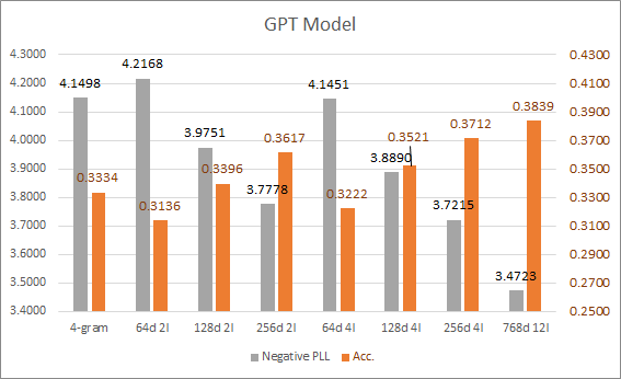 마지막으로 GPT 모델입니다. GPT 역시 GRU와 마찬가지로 각 단어의 임베딩 크기와 레이어의 개수가 성능에 큰 영향을 미칩니다. 최대한 비슷한 크기의 GRU 모델과 비교하기 위해 (64d, 128d, 256d) x (2l, 4l) 조합에 대해서 평가해봤습니다. 그리고 GPT-2 Small 크기인 768d 12l에 대해서도 테스트해봤습니다. 테스트에 사용한 모델 중 가장 큰 모델이기에 이 녀석의 결과는 이번 실험에서 도달할 수 있는 정확도의 상한치를 보여준다고 할 수 있겠네요 (학습에 사용한 데이터 크기가 작은지라 실제 GPT-2 small 모델은 저보다도 더 높은 성능을 달성할 수 있음에도 저 정도에서 멈췄다고 보는게 타당할 것 같아요). GPT 모델의 경우 임베딩의 크기가 작은 경우에는 GRU보다도 떨어지는 결과가 나옵니다. 그리고 레이어의 개수가 증가함에 따라 서서히 성능이 개선됩니다. 작은 임베딩에 적은 레이어를 써야하는 상황이라면 GPT보다는 1레이어짜리 RNN 모델이 훨씬 유리할 수 있겠습니다.