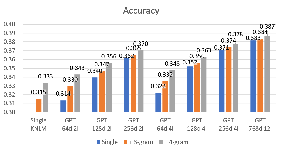 GRU 64d에 4-gram 앙상블을 한 경우 GPT 128d 4l와를 단독으로 쓰는 것과 거의 비슷한 성능을 보이는데요, GRU 64d의 연산량이 GPT 128d 4l의 1/10도 안 되기에, 메모리는 충분하지만 연산 속도가 부족한 경우 GRU 64d + 4-gram 조합으로 GPT 128d 4l을 대신할 수 있을지도 모릅니다. 메모리를 많이 차지하는 n-gram 모델과 연산량이 많은 신경망 모델을 적절히 조합함으로써 적당한 성능에 가벼운 모델을 만드는것도 가능하겠죠.