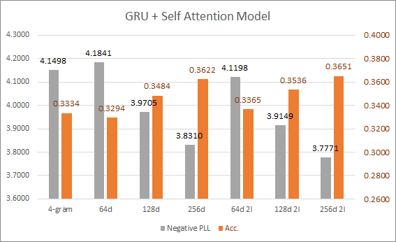 GRU에 Self-attention을 붙여서 모델이 이전에 출현한 단어들 중 원하는 단어의 정보에 다시 접근할 수 있도록 개선한 모델입니다. 그런데 단순 GRU 모델과 성능 차이가 사실상 없네요. GRU 셀을 2개를 붙여서 2 layer로 구성할 수 있지만(차트에서 2l이라고 표기된 항목들) 성능 향상이 크지는 않습니다. 64d 2l보다는 그냥 128d을 쓰는게 낫고, 128d 2l보다는 256d를 쓰는게 낫네요.