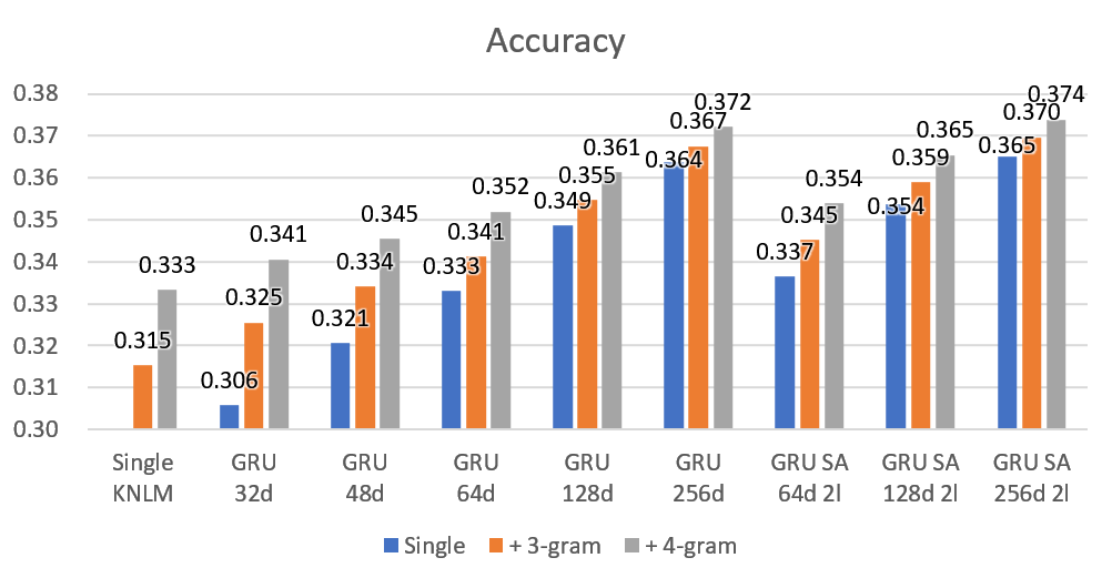 다음은 GRU 모델입니다. GRU 모델의 성능을 결정짓는 중요한 요소는 각 단어의 임베딩 크기와 GRU셀의 메모리(상태) 크기입니다. 임베딩 크기는 각 단어의 의미를 몇 개의 숫자로 나타낼지를 결정하며, 당연히 클수록 단어의 더 세밀한 의미를 표현해 낼 수 있습니다. GRU 셀의 메모리 크기는 모델이 이전까지 입력된 히스토리를 몇 개의 숫자로 기억하고 있을지를 결정합니다. 당연히 클 수록 더 많은 정보를 기억하고 있을 수 있구요. 위의 차트에 표시된 32d, 48d는 임베딩 크기이며, 메모리 크기는 임베딩 크기의 2배로 설정했습니다. 비교용으로 Kneser-ney 4-gram 모델의 결과도 함께 표현했는데요, 임베딩 크기가 64 이상인 경우 대략 4-gram 모델의 성능을 따라잡기 시작합니다. 그리고 여기서도 자명하게 임베딩 크기가 커질 수록 모델이 더 정확해지는 걸 확인할 수 있습니다.