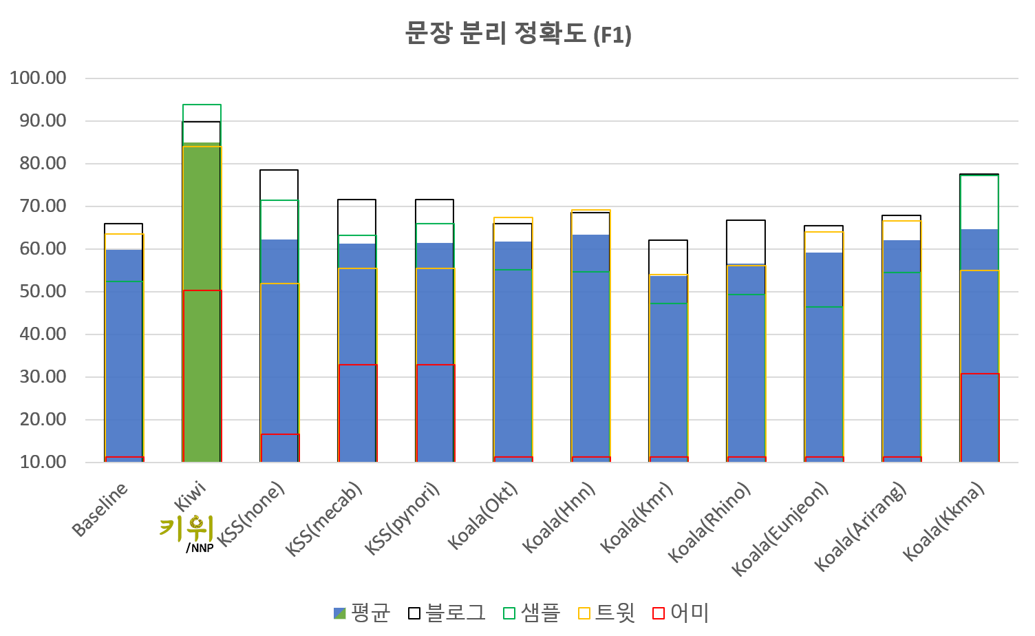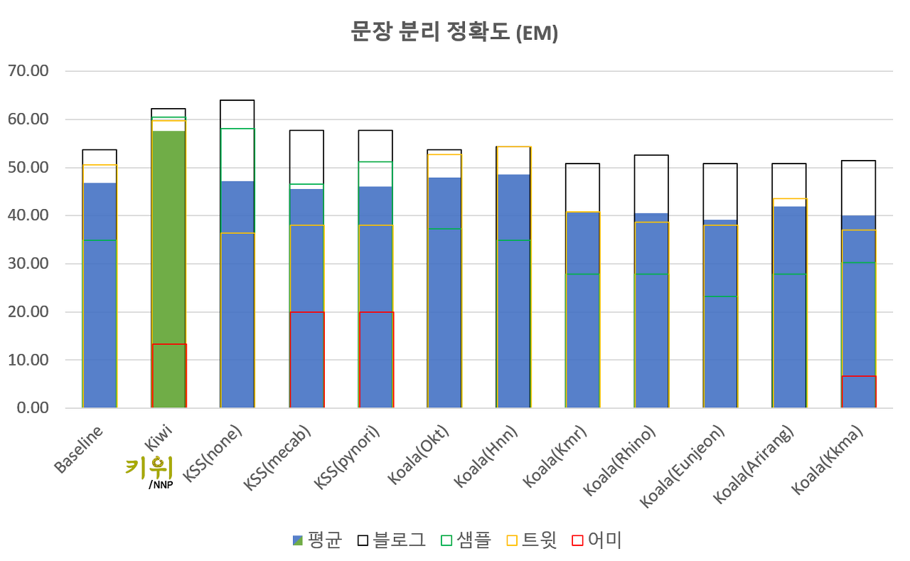그리고 고대하던 Kiwi의 결과는 놀라웠는데요, 블로그와 트윗 모두에서 안정적인 성능을 보이고 있고, 평균에서는 기존 도구들 중 제일 높은 정확도를 달성했습니다. 사실 기존 분석기에 별도의 추가 모델 없이 EF, SF 위치를 기반으로 자른 것이라 그저그런 성능을 보일 것이라 예상하고 있었거든요. 다만 아직 블로그 분석 결과의 경우 KSS(none)에 비해 약간 모자라는 것으로 확인되어 앞으로 이 부분을 개선해나가야 하겠습니다.