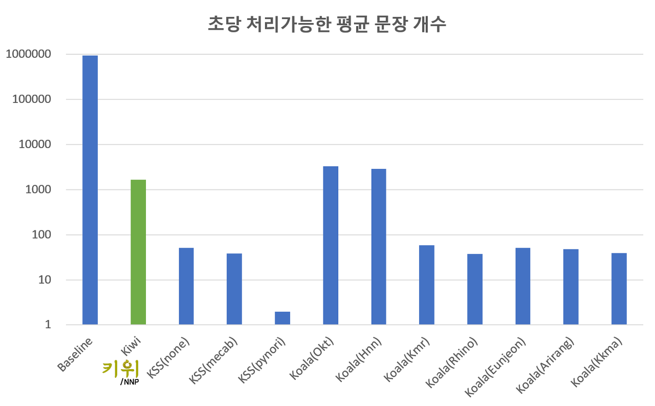 문장 분리의 경우 대량으로 수행해야하는 경우가 많을텐데요, 이 때문에 분리 속도도 간과할 수 없습니다. 아래는 단일 스레드에서 한 문장을 처리하는데 소요된 평균 시간을 바탕으로 초당 몇 문장까지 분리 가능한지를 계산해본 결과입니다.
