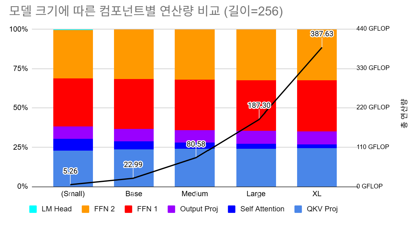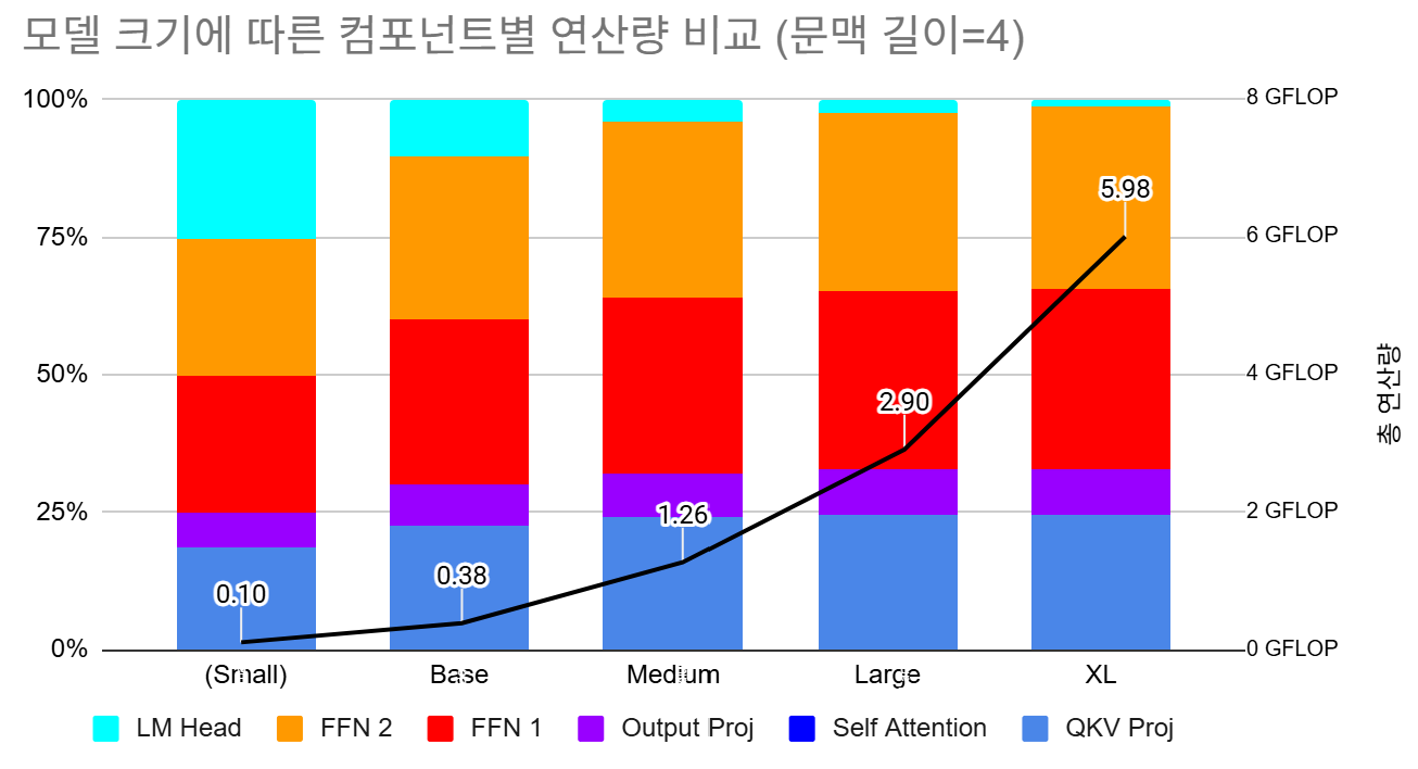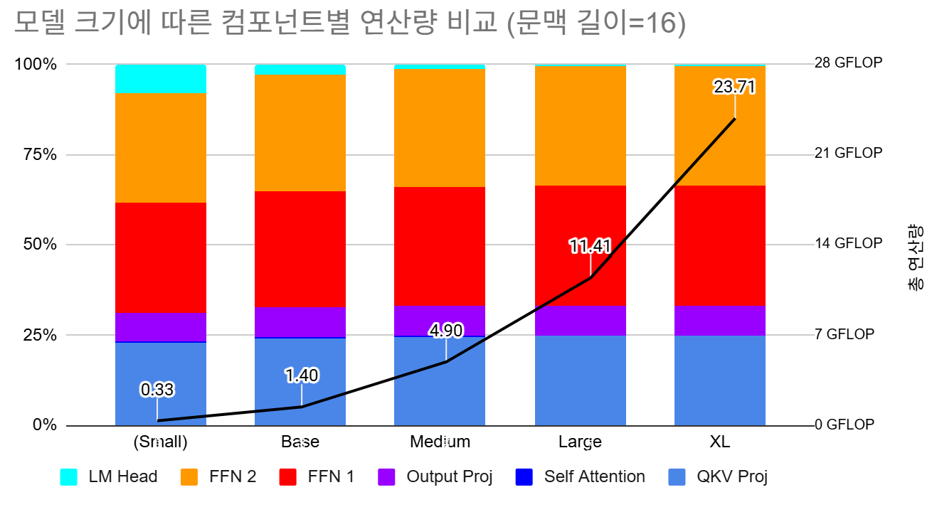 Small사이즈는 OpenAI에서 공개한 바는 없지만 개인적으로 판단하기에 Base조차도 CPU에서 돌리기에는 다소 부담이 있다고 생각하여 더 작은 크기인 Small을 임의로 비교군에 추가하였습니다. 이 모델들을 가지고 $P(x|y)$, 즉 문맥 $y$ 다음에 형태소 $x$가 등장할 확률이 얼마인지 추정할때 얼마나 많은 연산이 필요한지 FLOPs단위로 연산량을 추정해보았습니다.