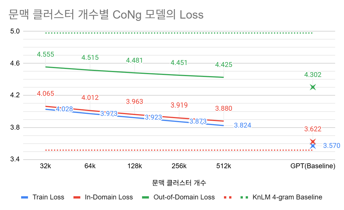 모두의 말뭉치에 있는 형태 분석 말뭉치를 대상으로 형태소들을 뽑아 Vocab을 구성한뒤 이를 통해서 GPT 모델을 학습시켰습니다. 그리고 위에서 설명한 절차대로 CoNg 모델을 학습시켰습니다. 문맥의 최소 빈도수는 5, 최대 길이는 4로 고정했고, 문맥 클러스터의 개수를 바꿔가면서 성능이 어떻게 바뀌는지 측정해보았습니다.