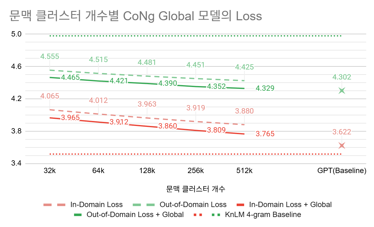 문맥 컨텍스트 개수 $s$를 늘릴수록 모델의 파라미터가 팍팍 늘어나는 것을 확인할 수 있습니다. 8비트 양자화를 한다고 가정해도 CoNg(256k)면 벌써 모델 크기가 100MB를 넘어갑니다. 모델 크기는 아쉽지만 그렇다고 $s$를 작게 잡으면 성능이 낮아지니 일단은 넉넉하게 $s$를 잡고 다양한 경량화 및 최적화 기법을 적용하는게 좋아보입니다.